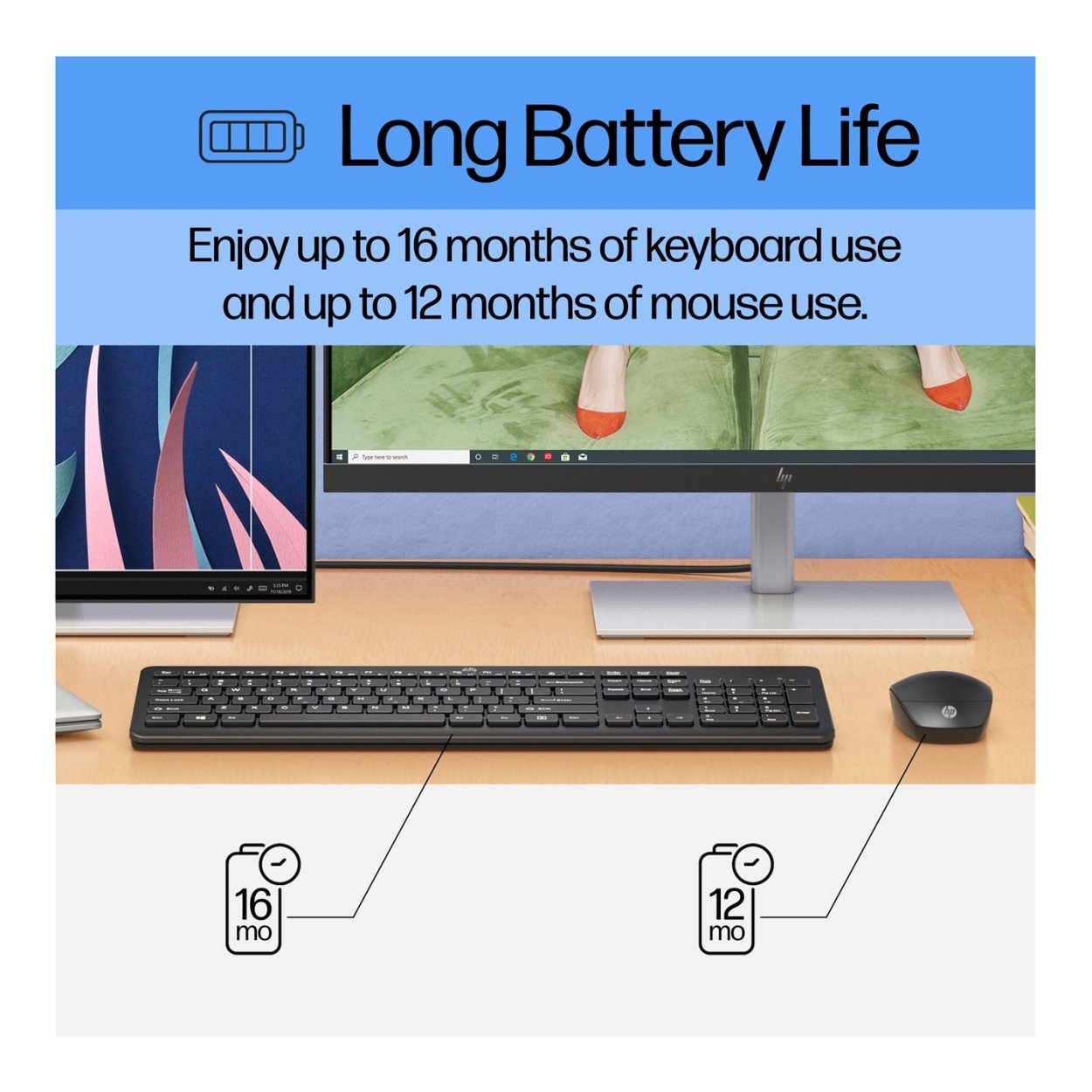 Serious battery life with a keyboard that lasts up to 16 months and a mouse that lasts up to 12 months.