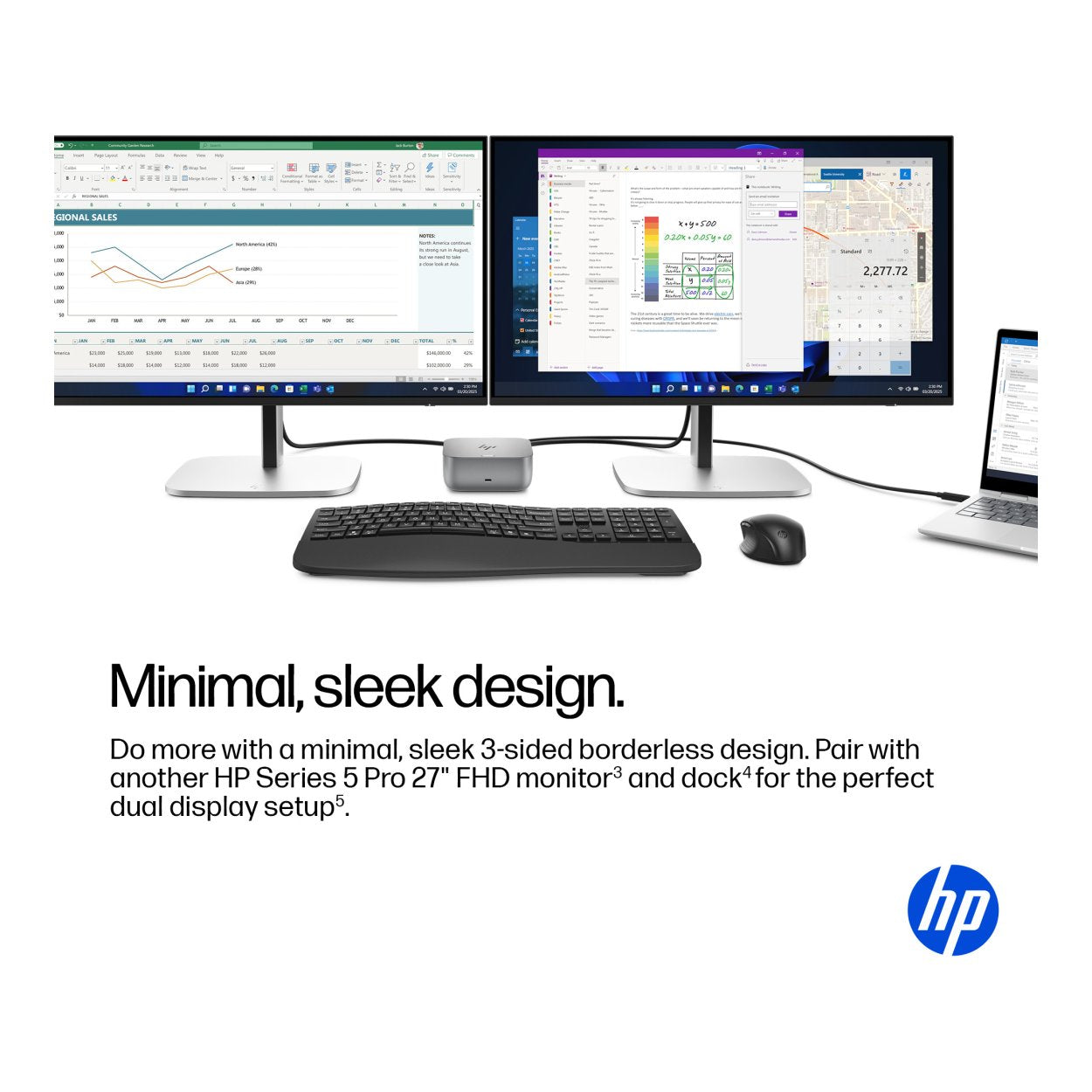 Change the way you see your desk. See more of your display with the 3-sided borderless with micro-edge bezel design. To get even more done, pair this display with another HP Series 5 Pro 27" FHD monitor and a dock for the perfect dual display setup