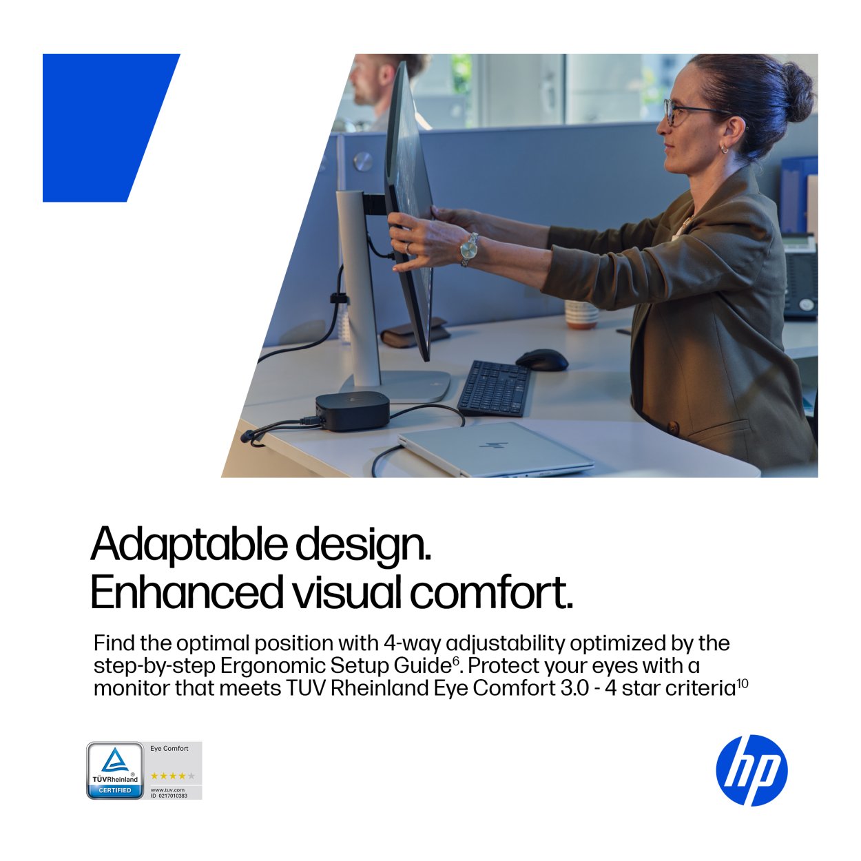 Feel your best all day. Find the optimal position with 4-way adjustability optimized by the step-by-step Ergonomic Setup Guide. Keep your eyes comfortable with TUV Rheinland Eye Comfort 3.0 and HP Eye Ease.